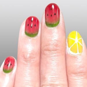 2022年7月ちょっとポップな雰囲気にしたくてフルーツ柄にしてみました。夏なのでスイカとレモン。やった時はご満悦でしたが後から見ると、改良の余地ありありですね。。。