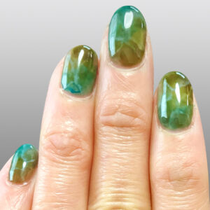 2021年4月緑系で鉱石風にしてみました。透明の緑のジェル2種を混ぜて白でインクルージョン風の模様を入れています。まだまだ技術が足りない。。。経験を積めば上手くなる。。。かな?